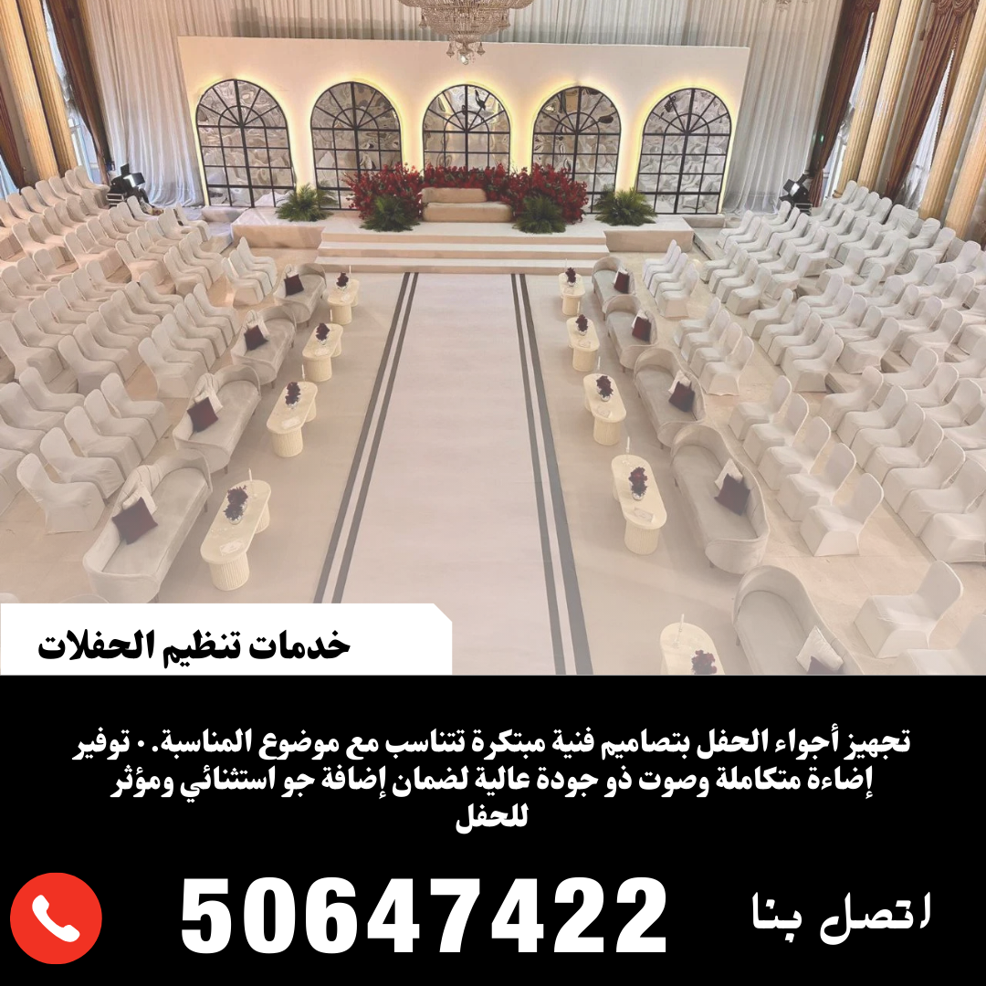 تريد اقام عرس او اقامة حفل تخرج او لديك مناسبة عيد ميلاد او لديكم لا قدر الله عزاء خدمة حفلات اعياد ميلاد او مؤتمر او معرض او اي مناسبة وتجهيز صالات الافراح او تجهيز طاولات الافراح، لدينا عمال متخصصون في تنظيم وترتيب الحفلات والمناسبات ما عليك سوي الاتصال بنا وسوف يتوجه العمال مكان المناسبة