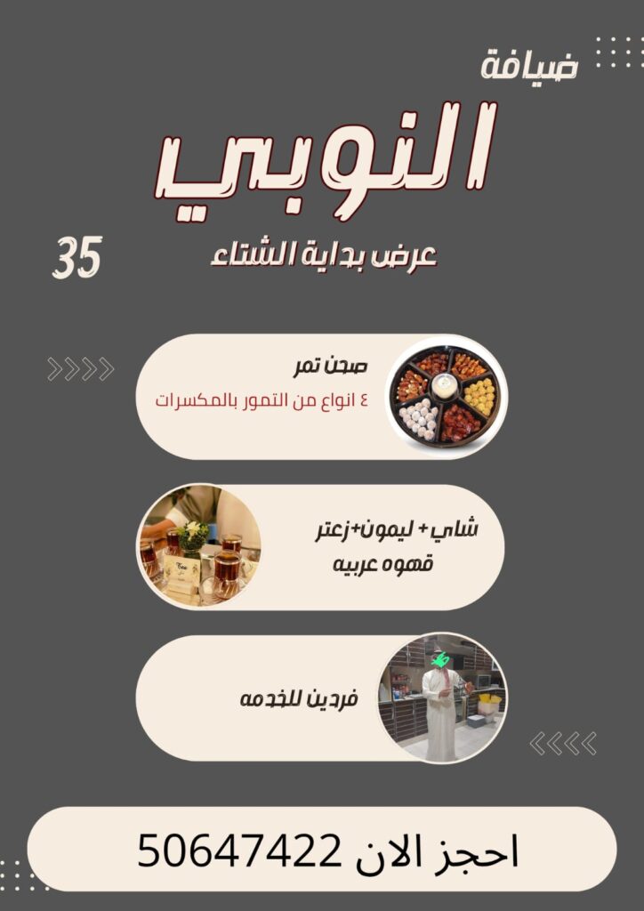 خدمة ضيافة النوبي جميع خدمات الضيافة الراقية لجميع المناسبات خدمة ضيافة شاي وقهوه بأفضل الأسعار وأجود حفلات وعزاء لا قدر الله خدمة بالمنزل والديوانية والمستشفيات والمدارس جميع المشروبات الباردة والساخنة قهوة عربية شاي ولومي وزعتر ودارسين وجميع العصائر الطازجة من خلال خدمة فلبينيات للمناسبات ولدينا خدمة فاليه خدمة سيارات فاليه وخدمة المهراجا وتصوير فيديو وفوتوغرافي وتأجير جميع مستلزمات الحفلات والمناسبات من طاولات وكراسي وخيام وتكييف ودفايات وسجاد وزينة أفراح وكل ما يلزم